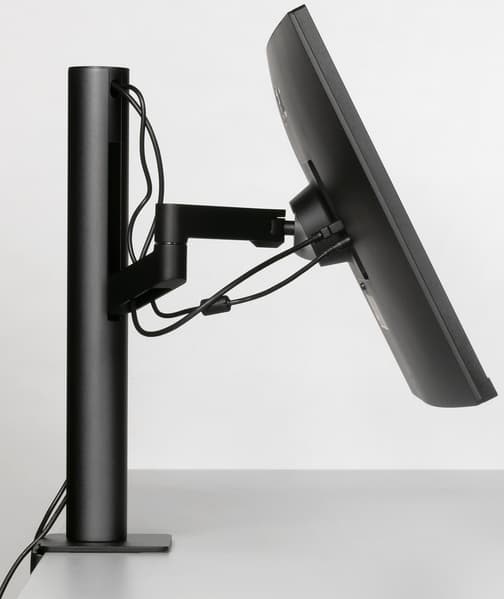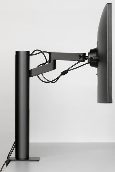 Площадки, контактирующие со столешницей, имеют резиновые накладки. Эта подставка имеет много степеней свободы: поворот в горизонтальной плоскости обеспечивают шарниры в основании стойки, на сочленении первого рычага со вторым и на сочленении второго рычага с крепежной площадкой. Это обеспечивает поворот блока экрана на ±280°, а также смещение плоскости экрана вперед-назад в диапазоне 180 мм (по данным производителя).