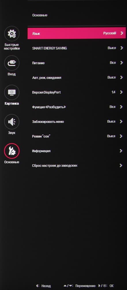 Надписи в меню достаточно крупные и читаемые. Благодаря логике переходов и джойстику, с которого не нужно снимать палец, навигация по меню очень удобная и быстрая. В текущем сеансе работы запоминается позиция вплоть до второго уровня меню, что позволяет быстро вернуться к настройке параметра. Чтобы предотвратить нежелательное изменение настроек, можно включить частичную блокировку меню. Есть русская версия экранного меню. Кириллический шрифт меню ровный, надписи читаемые. Качество перевода на русский язык приемлемое, хотя ошибки встречаются. Присутствует функция выключения монитора после отсутствия активности в течение определенного времени.