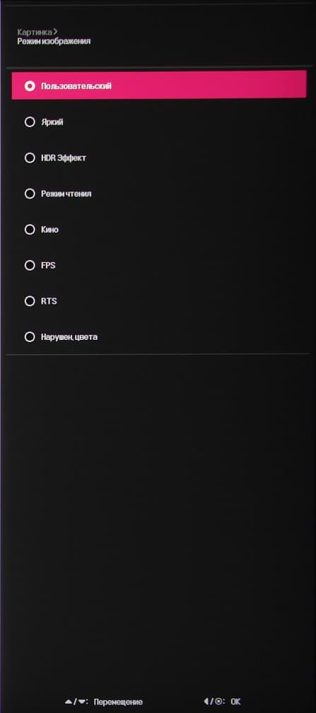 Есть несколько предустановленных профилей (список Режим изображения) с заданными значениями настроек изображения и пользовательский, в котором доступно большинство настроек.