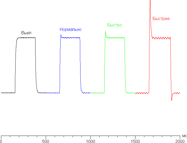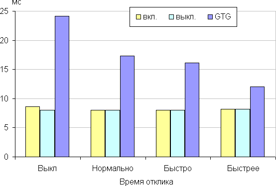 Время отклика зависит от значения одноименной настройки, которая управляет разгоном матрицы. Диаграмма ниже показывает, как меняется время включения и выключения при переходе черный-белый-черный (столбики «вкл.» и «выкл.»), а также среднее суммарное (от первого оттенка до второго и обратно) время для переходов между полутонами (столбики «GTG»):