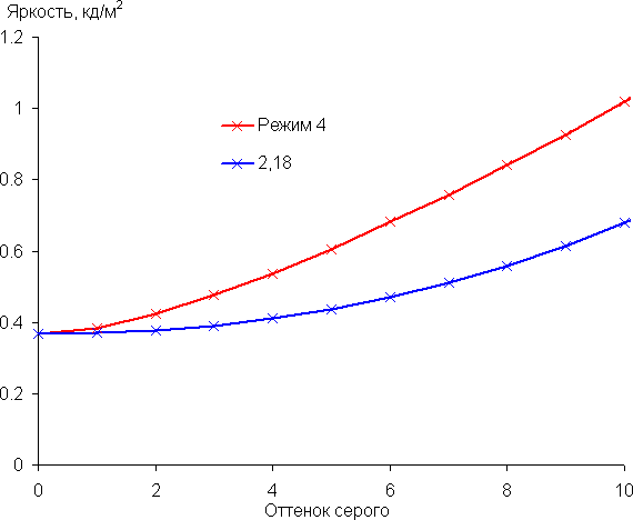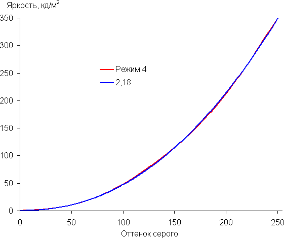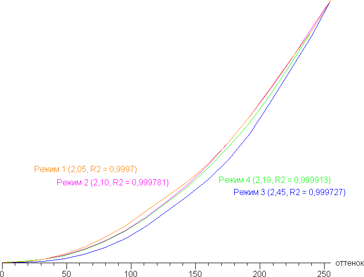 Реальная гамма-кривая зависит от выбранного профиля (Режим 1 — 4) в списке Гамма (значения показателей аппроксимирующей функции приведены в скобках в подписях, там же — коэффициент детерминации R²):