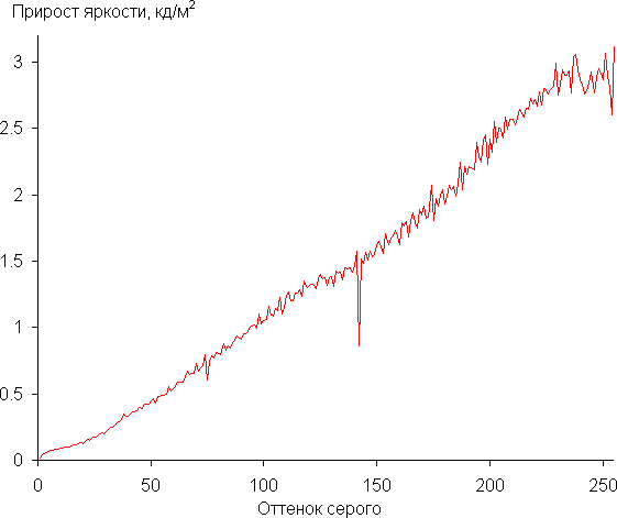 Реальная гамма-кривая ближе всего к стандартной при выборе Режим 4, поэтому далее мы измерили яркость 256 оттенков серого (от 0, 0, 0 до 255, 255, 255) при этом значении. График ниже показывает прирост (не абсолютное значение!) яркости между соседними полутонами: