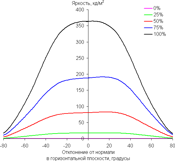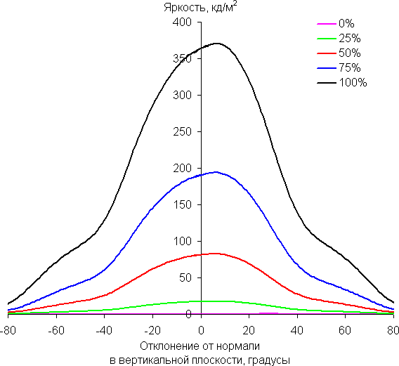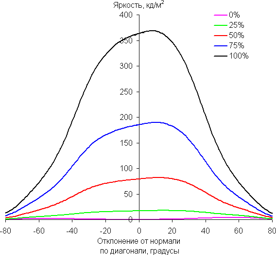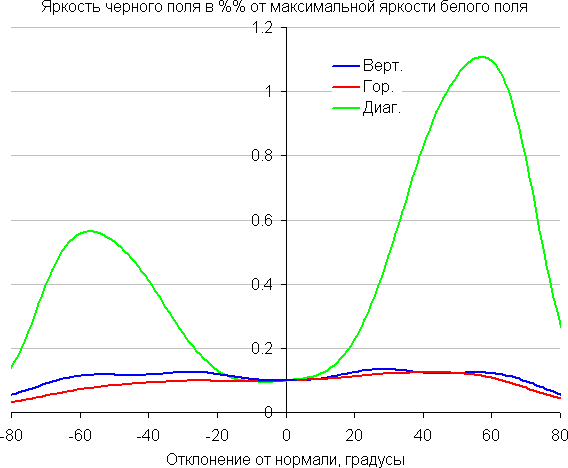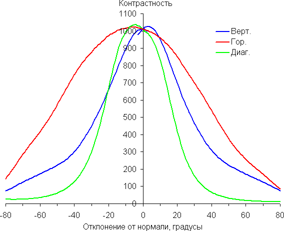 Отметим плавное уменьшение яркости при отклонении от перпендикуляра к экрану в горизонтальном направлении, при этом графики не пересекаются во всем диапазоне измеряемых углов. Чуть быстрее падает яркость при отклонении в вертикальном направлении. При отклонении в диагональном направлении поведение яркости оттенков имеет промежуточный характер между вертикальным и горизонтальным направлениями, за исключением яркости черного поля, которая начинает резко возрастать уже при 20°-30° отклонения от перпендикуляра к экрану. Если сидеть не очень далеко от экрана, то черное поле по углам будет заметно светлее, чем в центре. Контрастность в диапазоне углов ±82° в случае отклонения по диагонали приближается к отметке 10:1, но не опускается ниже.
