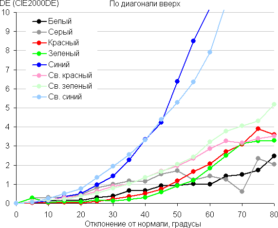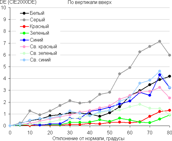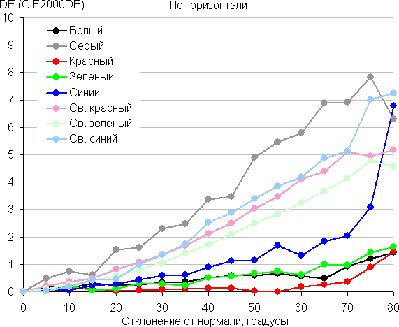 Для количественной характеристики изменения цветопередачи мы провели колориметрические измерения для белого, серого (127, 127, 127), красного, зеленого и синего, а также светло-красного, светло-зеленого и светло-синего полей во весь экран с использованием установки, подобной той, что применялась в предыдущем тесте. Измерения проводились в диапазоне углов от 0° (датчик направлен перпендикулярно к экрану) до 80° с шагом в 5°. Полученные значения интенсивностей были пересчитаны в ΔE относительно замера каждого поля при перпендикулярном положении датчика относительно экрана. Результаты представлены ниже:
