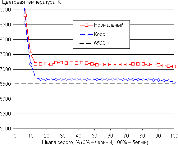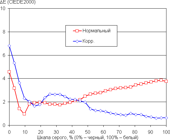 Самый близкий к черному диапазон можно не учитывать, так как в нем цветопередача не так важна, а погрешность измерения цветовых характеристик высокая. Ручная коррекция еще больше приблизила цветовую температуру к 6500 К и в среднем уменьшила значение ΔE. Впрочем, для бытового применения в коррекции необходимости нет.