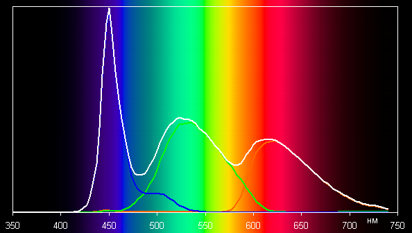 Такой спектр с относительно узким пиком синего и с широкими горбами зеленого и красного цветов характерен для мониторов, в которых используется белая светодиодная подсветка с синим излучателем и желтым люминофором.