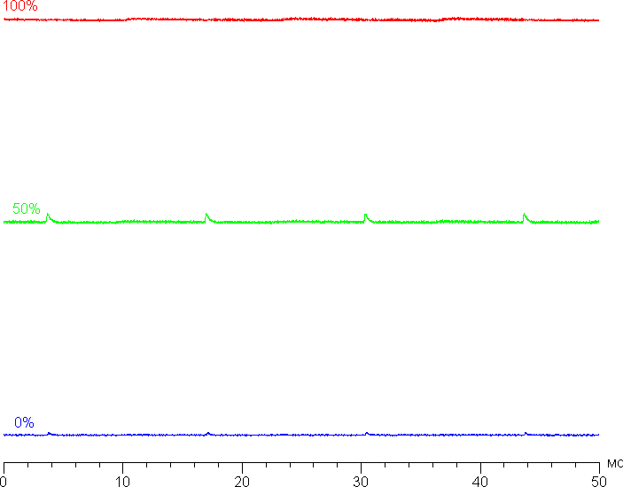 Яркость монитора меняется именно яркостью подсветки, то есть без ущерба для качества изображения (сохраняется контрастность и количество различимых градаций) яркость монитора можно менять в широких пределах, что позволяет с комфортом работать, играть и смотреть фильмы как в освещенном, так и в темном помещении. На любом уровне яркости значимая модуляция подсветки отсутствует, что исключает видимое мерцание экрана. Для тех, кто привык распознавать знакомое сокращение, уточним: ШИМ отсутствует. В доказательство приведем графики зависимости яркости (вертикальная ось) от времени (горизонтальная ось) при различных значениях настройки яркости: