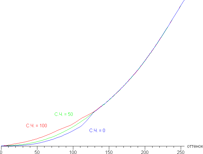 Видно, что меняется только скорость роста яркости в тенях, а светлая часть гамма-кривой остается неизменной, при этом уровень черного остается постоянным, то есть контрастность не снижается.