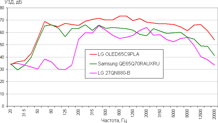 Качество встроенных громкоговорителей невысокое. Для сидящего перед монитором пользователя они достаточно громкие, низких частот нет совсем, есть выраженный «пластиковый» призвук из-за резонансов корпуса, стереофонический эффект слабый. Сравним АЧХ этого монитора с АЧХ двух телевизоров высшего класса (воспроизводился розовый шум, уровни звукового давления в 1/3 октавах записывал шумомер Октава-110А-Эко):