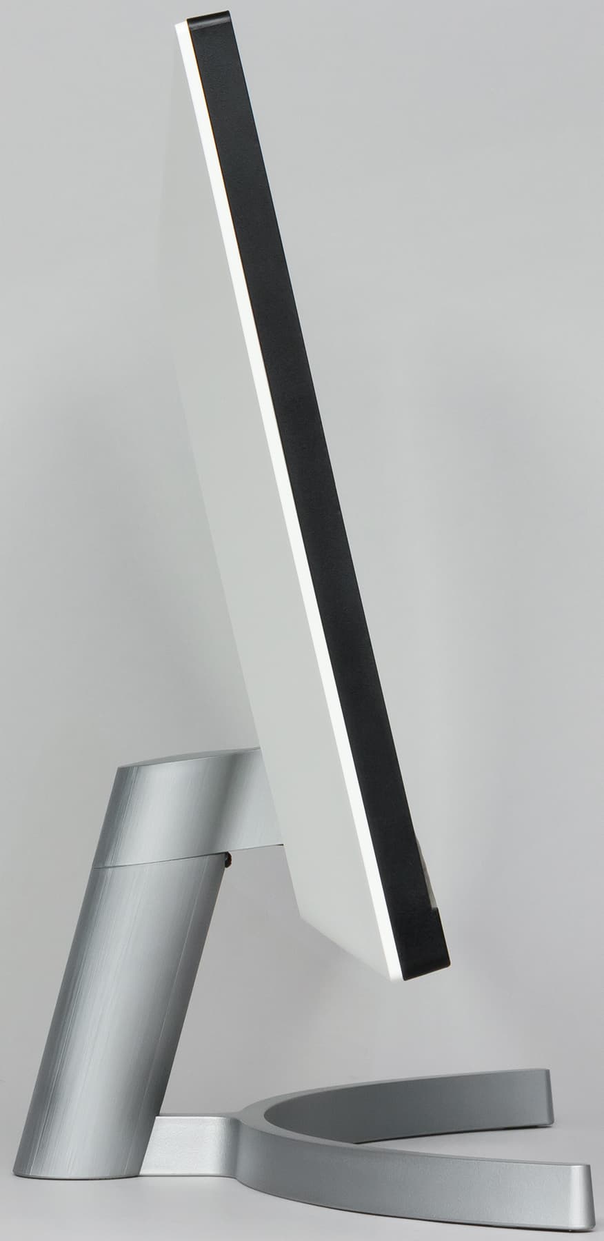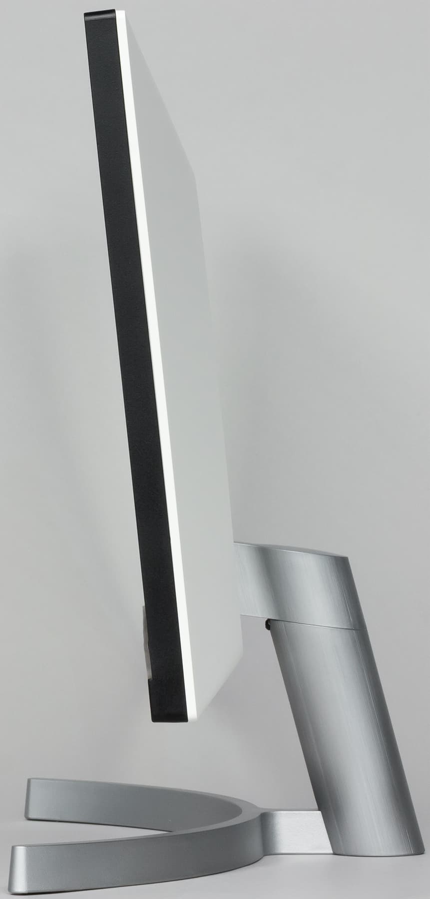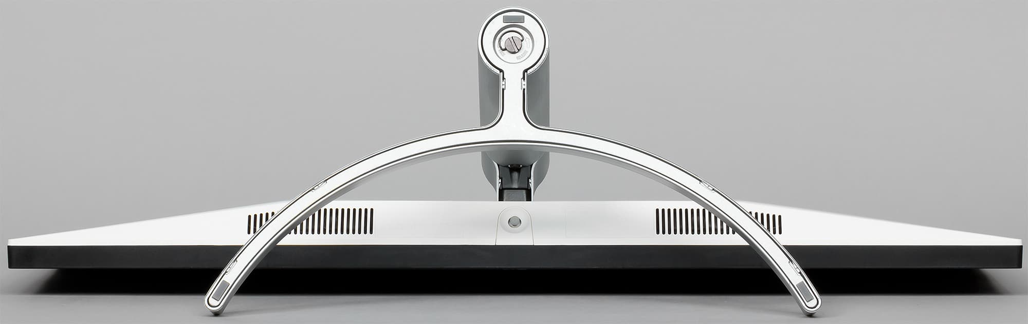 Подставка состоит из двух частей — из основания и стойки. Чтобы выдержать вес монитора, основание и ряд ответственных деталей изготовлены из алюминиевого сплава. Стойку выполнили из прочного пластика, но резьбовое гнездо в ней, куда вворачивается крепежный винт основания, сделано из стали. Конструкция подставки достаточно жесткая. Стоит монитор устойчиво. Резиновые накладки снизу на основании подставки защищают поверхность стола от царапин и предотвращают скольжение монитора на гладких поверхностях. Изогнутая дуга-основание занимает не много места на рабочем столе.
