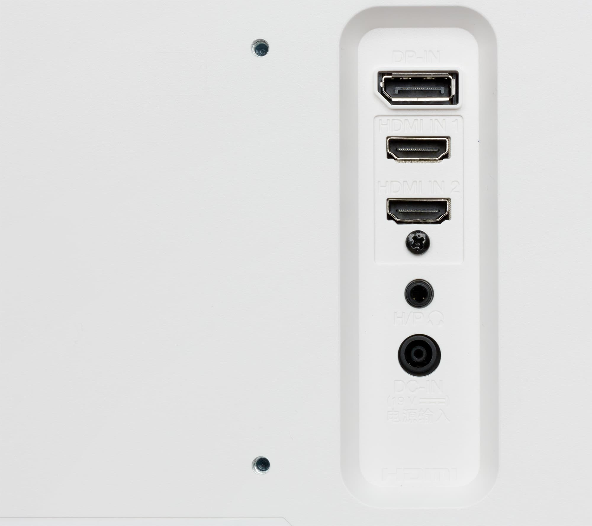На нижнем торце блока экрана есть две разнесенные вентиляционные решетки, за которыми можно рассмотреть по громкоговорителю с вытянутым диффузором. Громкоговорители установлены в индивидуальные боксы. Еще одна вентиляционная решетка — на задней панели выше. Разъем питания и все интерфейсные разъемы размещены в неглубокой нише на задней панели и ориентированы назад. Так же на задней панели можно обнаружить разъем для кенсингтонского замка.