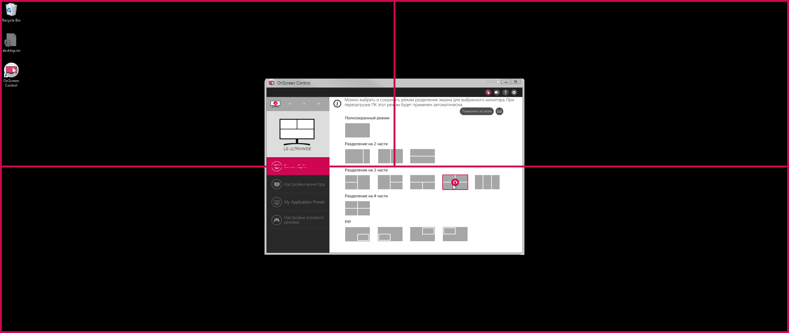 - выполняется принудительное растягивание картинки на всю площадь экрана (Широкоформатный);