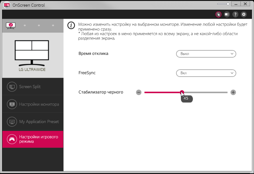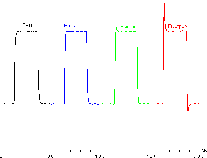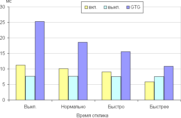 Время отклика зависит от значения одноименной настройки, которая управляет разгоном матрицы. Ступени регулировки четыре. График ниже показывает, как меняется время включения и выключения при переходе черный-белый-черный (столбики «вкл.» и «выкл.»), а также среднее суммарное время для переходов между полутонами (столбики GTG):