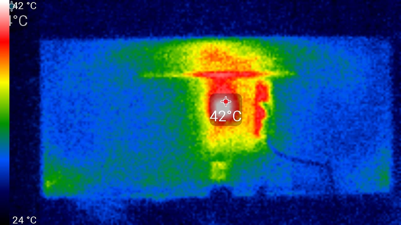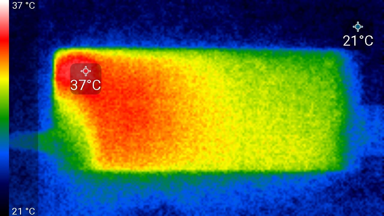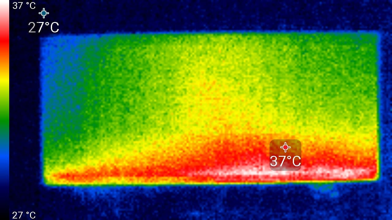 Спереди в нижней части экрана была зафиксирована температура в 37 °C — видимо, там находится светодиодная линейка подсветки экрана. Сзади локально температура достигает 45 °C, возможно в этом месте непосредственно за задней панелью находится сильно греющаяся микросхема. Корпус блока питания нагрелся до 37 °C максимум: