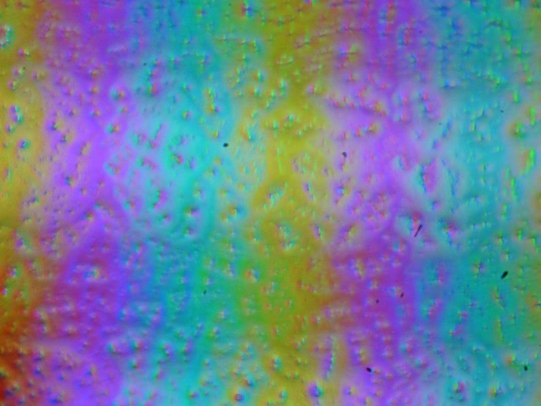 Зерно этих дефектов в несколько раз меньше размеров субпикселей (масштаб этих двух фотографий одинаковый), поэтому фокусировка на микродефектах и «перескок» фокуса по субпикселям при изменении угла зрения выражены слабо, из-за этого нет и «кристаллического» эффекта.