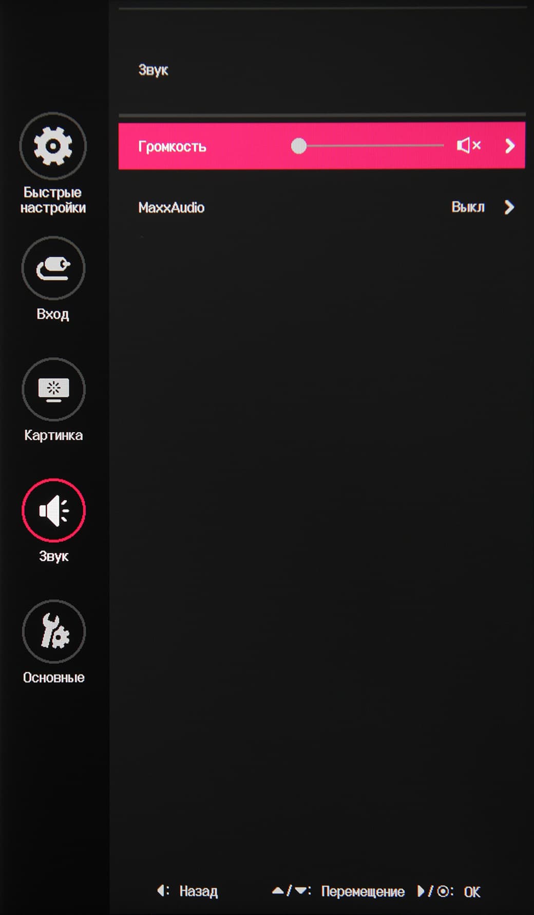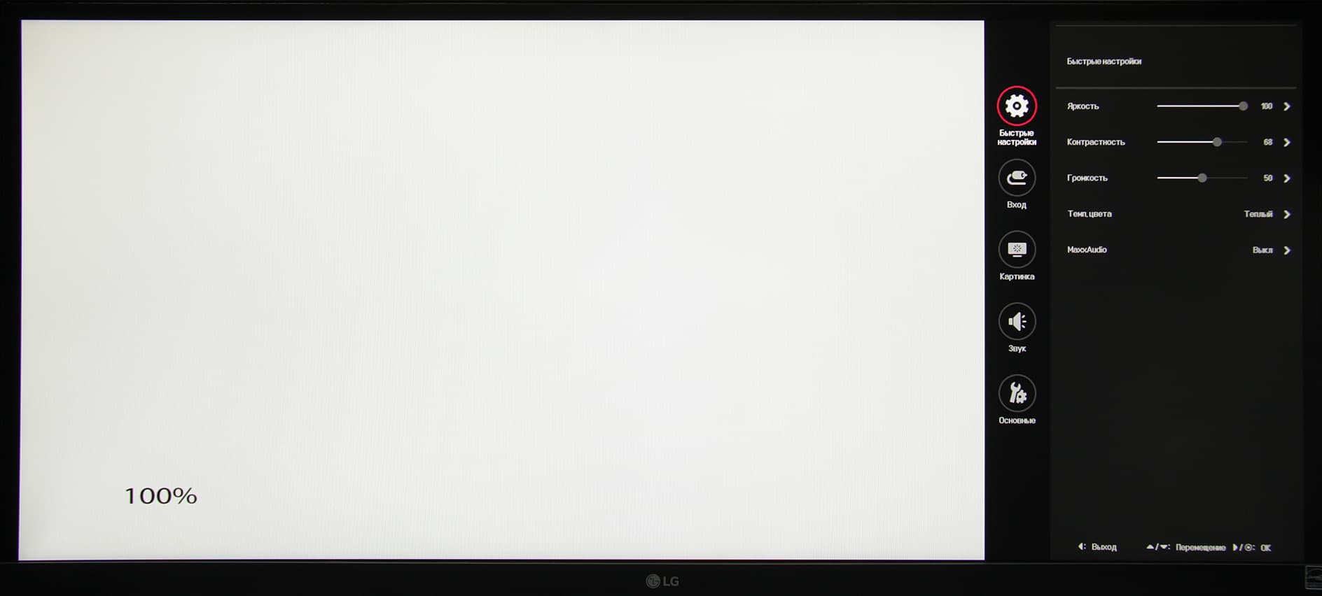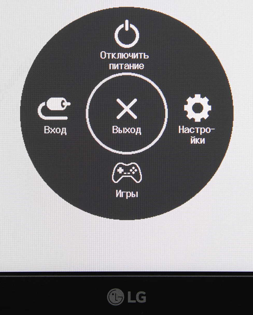 Джойстик при работе неярко подсвечивается белым (отключается в меню), редко мигает белым в режиме ожидания и не горит, если монитор условно выключен. Когда на экране нет меню, то отклонение джойстика влево или вправо выводит ползунок громкости, а вверх или вниз — информацию о текущем входе. Короткое нажатие выводит стартовое круглое меню.
