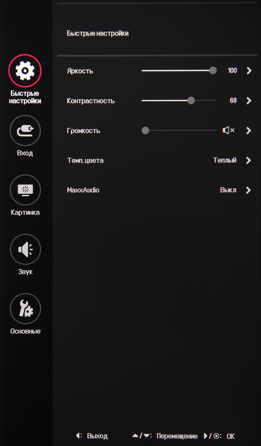 Из стартового меню можно выйти, перейти к выбору входа, к основному меню, в игровое меню, или выключить монитор. Далее при навигации по меню в нижней его части выводится подсказка по текущим функциям джойстика. Меню занимает на экране примерно ¼ часть площади вертикальной полосой в правой части, что, конечно, мешает оценке вносимых изменений.