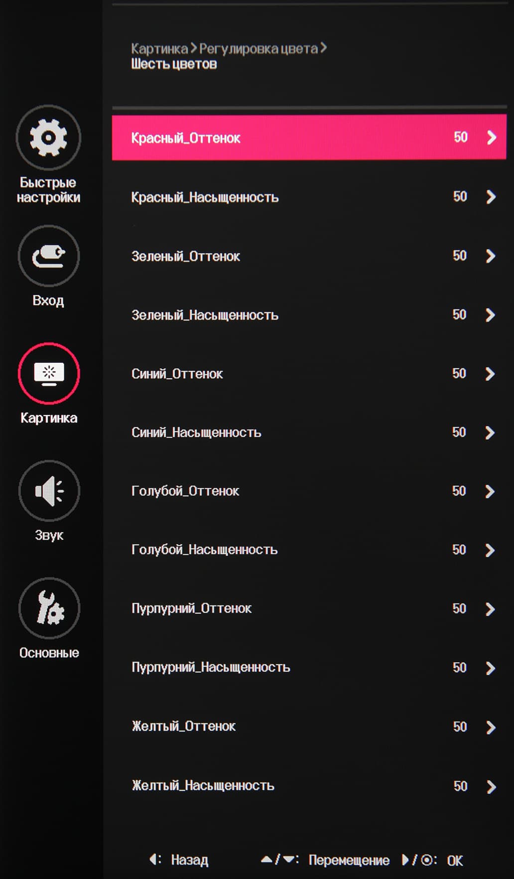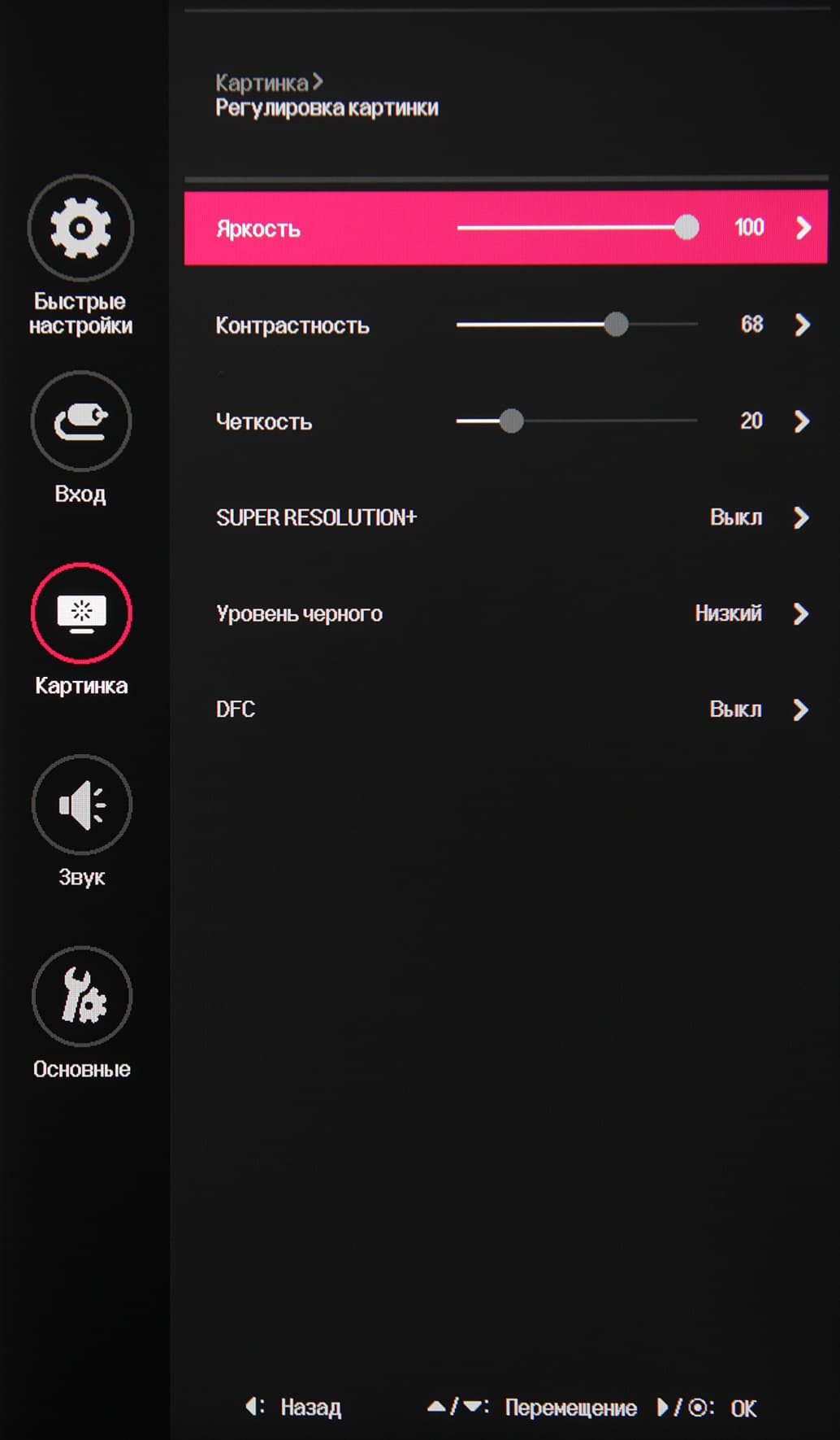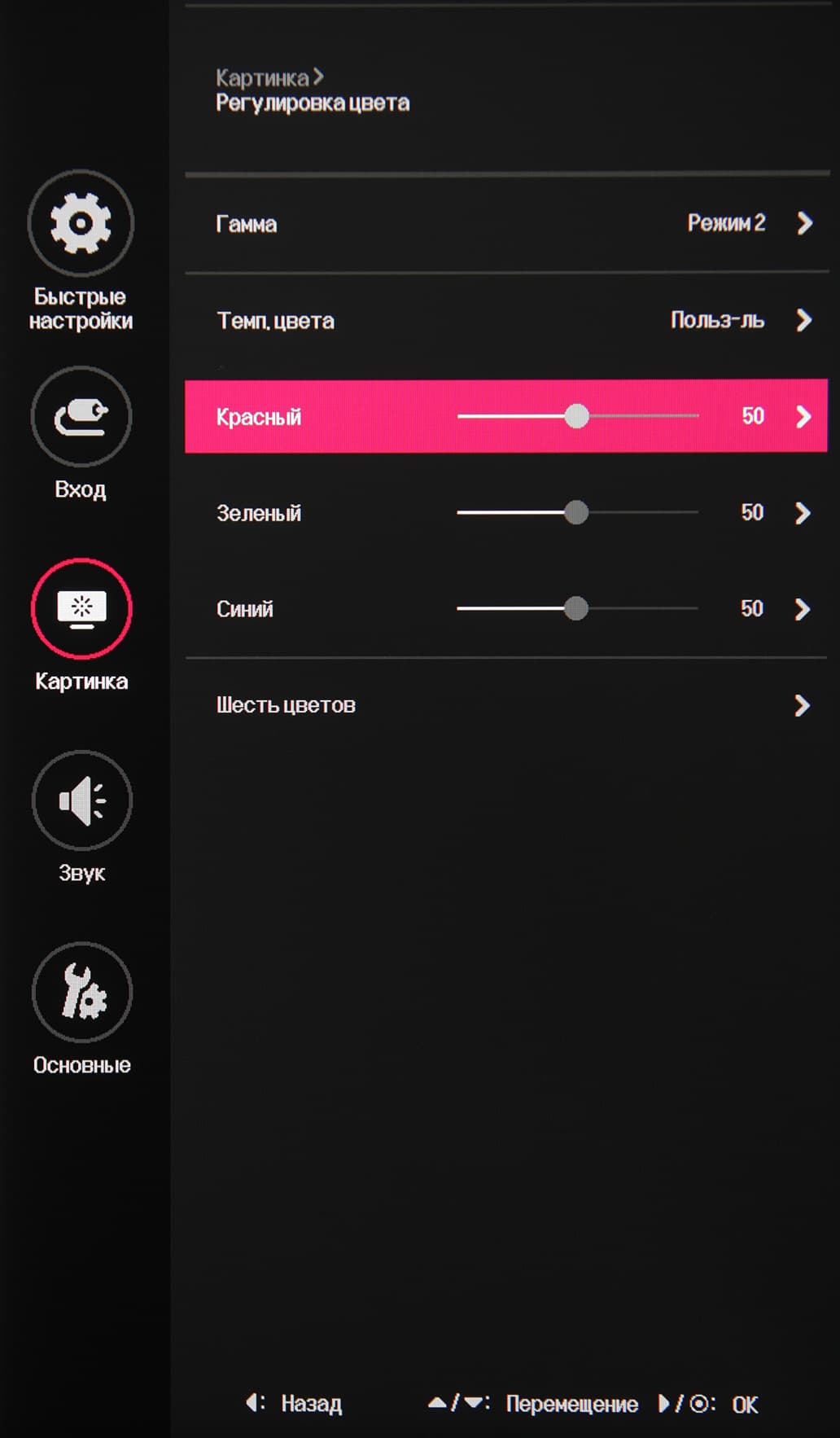 В случае сигнала HDR доступны только четыре предустановленных HDR-профиля. Присутствуют стандартные настройки Яркость, Контрастность и Четкость. Есть функция улучшения изображения с низким разрешением Super Resolution+. В списке выбирается профиль гамма-коррекции, а цветовой баланс корректируется выбором одного из трех профилей цветовой температуры или ручной регулировкой интенсивности трех цветов, а также оттенка и насыщенности шести цветов.