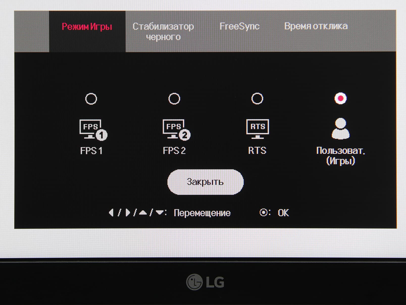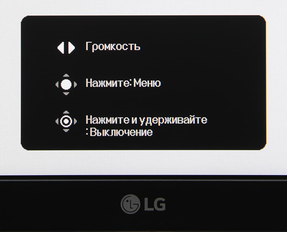Длительное нажатие, когда нет меню, выключает монитор. При включении монитора раздается звуковой сигнал (его можно отключить в настройках), а на экран на несколько секунд выводится подсказка по функциям джойстика.
