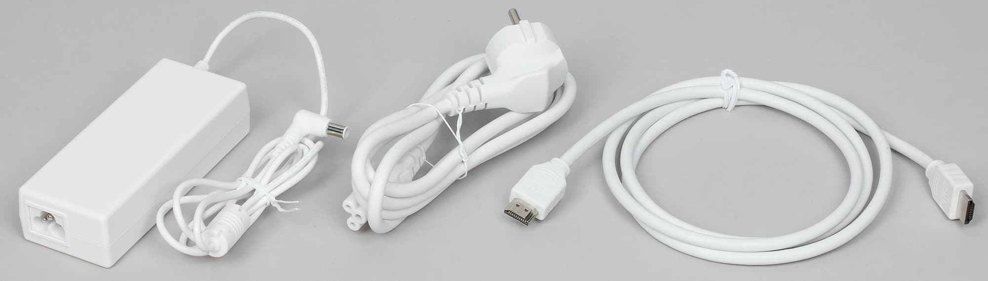 Комплектные HDMI-кабель, кабель питания и блок питания — белого цвета, что сочетается с цветом задней панели корпуса монитора.