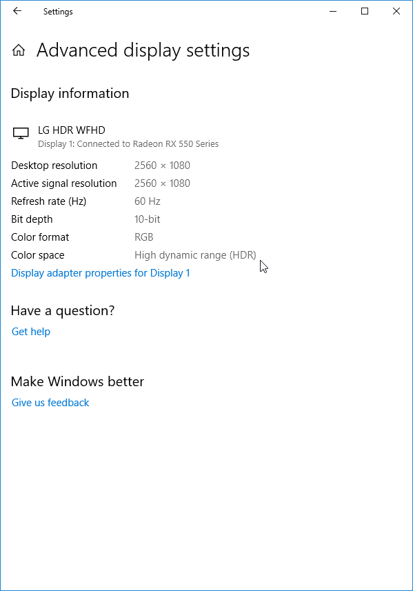 Под Windows 10 вывод в режиме HDR на данный монитор возможен как на системном уровне при выборе соответствующих опций в настройках, так и при воспроизведении в видеоплеере в полнооконном режиме с помощью видеорендерера madVR независимо от настроек ОС.