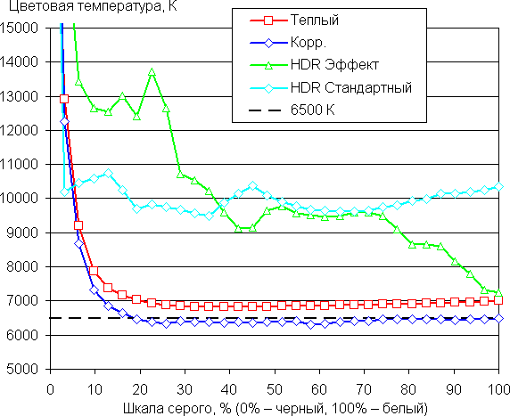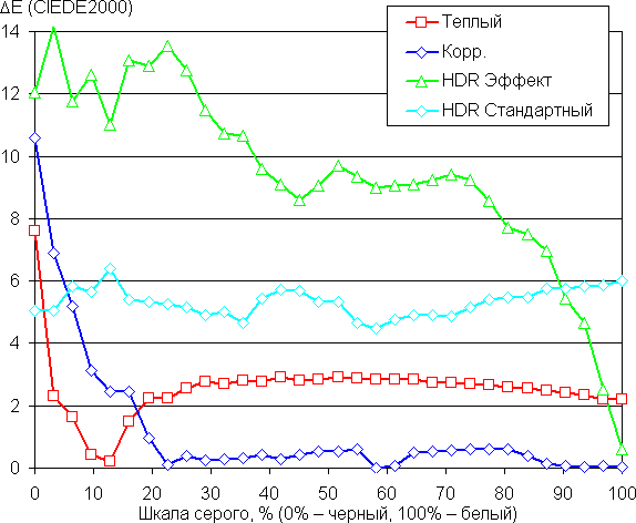 Самый близкий к черному диапазон можно не учитывать, так как в нем цветопередача не так важна, а погрешность измерения цветовых характеристик высокая. Ручная коррекция еще больше снизила ΔE на большей части шкалы серого. Впрочем, выполнять такую коррекцию особого смысла нет, цветовой баланс и без нее достаточно хороший в случае не профессионального использования. Для сравнения приведены данные, полученные при выборе профиля HDR Эффект и для режима HDR при выборе профиля HDR Стандартный. В этих случаях цветовой баланс явно не в приоритете.