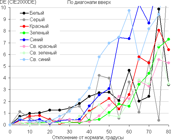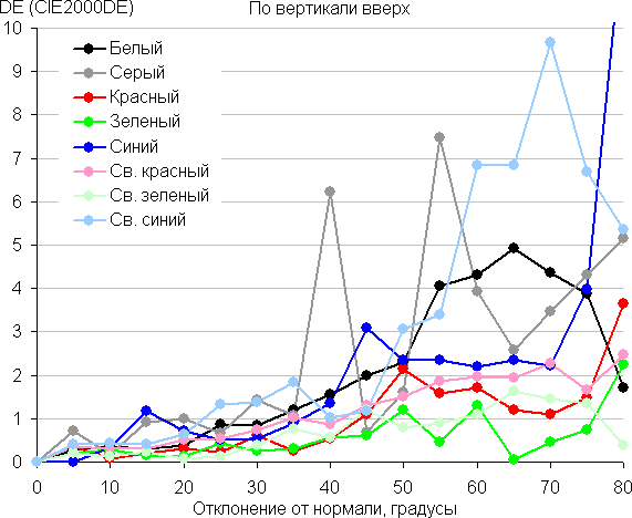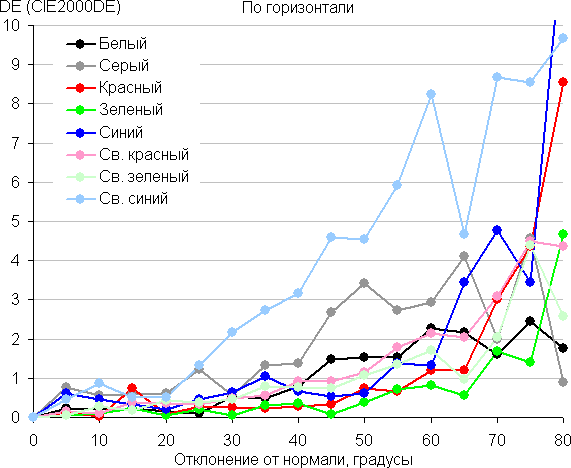 Для количественной характеристики изменения цветопередачи мы провели колориметрические измерения для белого, серого (127, 127, 127), красного, зеленого и синего, а также светло-красного, светло-зеленого и светло-синего полей во весь экран с использованием установки, подобной той, что применялась в предыдущем тесте. Измерения проводились в диапазоне углов от 0° (датчик направлен перпендикулярно к экрану) до 80° с шагом в 5°. Полученные значения интенсивностей были пересчитаны в ΔE относительно замера каждого поля при перпендикулярном положении датчика относительно экрана. Результаты представлены ниже: