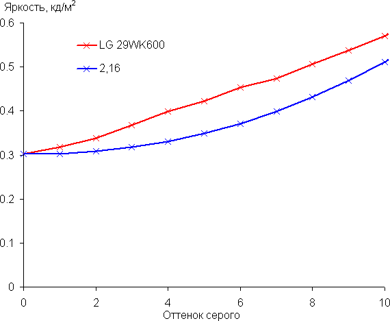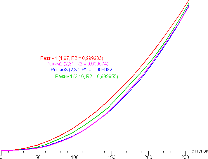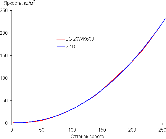 Аппроксимация полученной гамма-кривой дала показатель 2,16, что немного ниже стандартного значения 2,2, при этом реальная гамма-кривая чуть-чуть отклоняется от аппроксимирующей степенной функции: