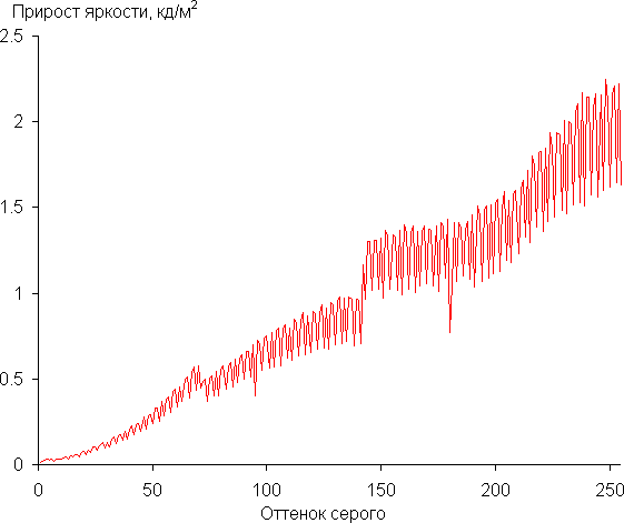 Отметим, что настройку Контрастность мы уменьшили до 55 (по умолчанию 70), так как при превышении этого значения наблюдался существенный перегиб в светлой части гамма-кривой. Реальная гамма-кривая ближе всего к стандартной при выборе Режим4, поэтому далее мы измерили яркость 256 оттенков серого (от 0, 0, 0 до 255, 255, 255) при этом значении. График ниже показывает прирост (не абсолютное значение!) яркости между соседними полутонами: