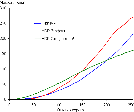 Просто для сравнения приведем гамма кривые для варианта Режим4, в случае профиля HDR Эффект и для режима HDR при выборе профиля HDR Стандартный (вывод в SDR, в настройках ОС яркость для SDR установлена на максимум):