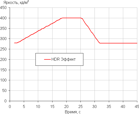 При выборе профиля HDR Эффект и при выводе белого поля на весь или почти на весь экран яркость достигает максимального значения, но только на какое-то время. Приведем график изменения яркости при переключении на вывод белого поля после нескольких секунд вывода черного поля: