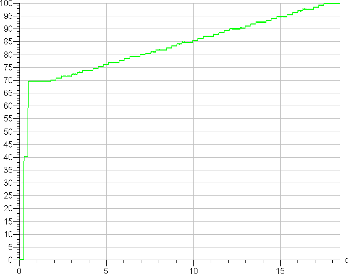 Максимальное значение яркости достигает 400 кд/м² и держится на этом уровне несколько секунд, затем снижается до обычного значения. Запись начального участка с высокой частотой дискретизации выявляет ступенчатый характер изменения яркости, это видно и невооруженным глазом: