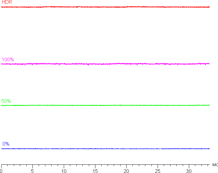 Яркость монитора меняется именно яркостью подсветки, то есть без ущерба для качества изображения (сохраняется контрастность и количество различимых градаций) яркость монитора можно менять в достаточно широких пределах, что позволяет с комфортом работать и смотреть фильмы как в освещенном, так и в темном помещении. На любом уровне яркости значимая модуляция подсветки отсутствует, поэтому нет и никакого мерцания экрана. В доказательство приведем графики зависимости яркости (вертикальная ось) от времени (горизонтальная ось) при различных значениях настройки яркости: