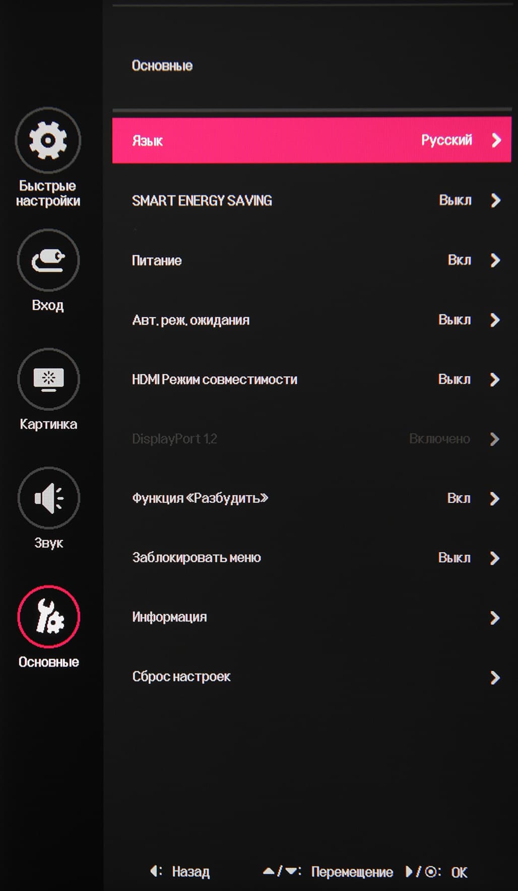 При этом сами надписи в меню мелкие и широко разнесены по вертикали. Благодаря логике переходов и джойстику, с которого не нужно снимать палец, навигация по меню очень удобная и быстрая. Чтобы предотвратить нежелательное изменение настроек, можно включить частичную блокировку пунктов меню. Есть русская версия экранного меню. Кириллический шрифт меню ровный, надписи читаемые. Качество перевода на русский язык приемлемое.