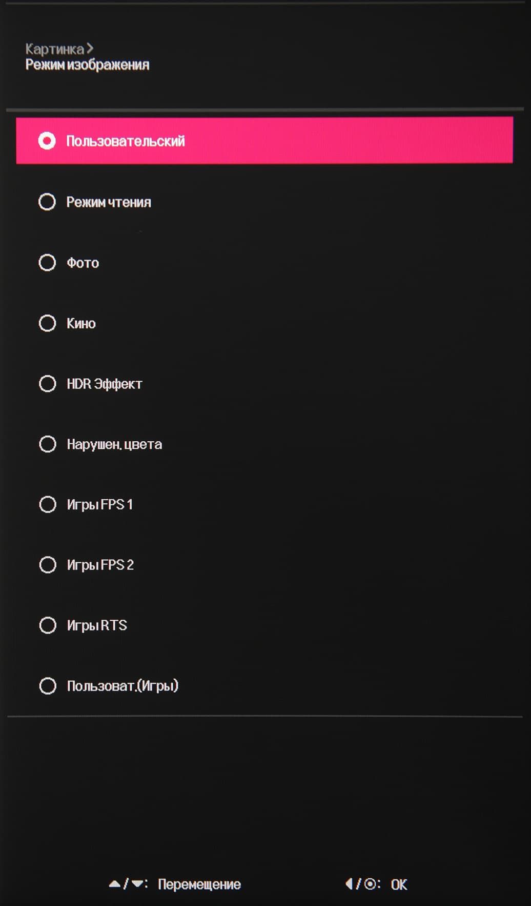 Есть несколько предустановленных профилей с заданными значениями настроек изображения и два пользовательских, в которых настройки можно менять.