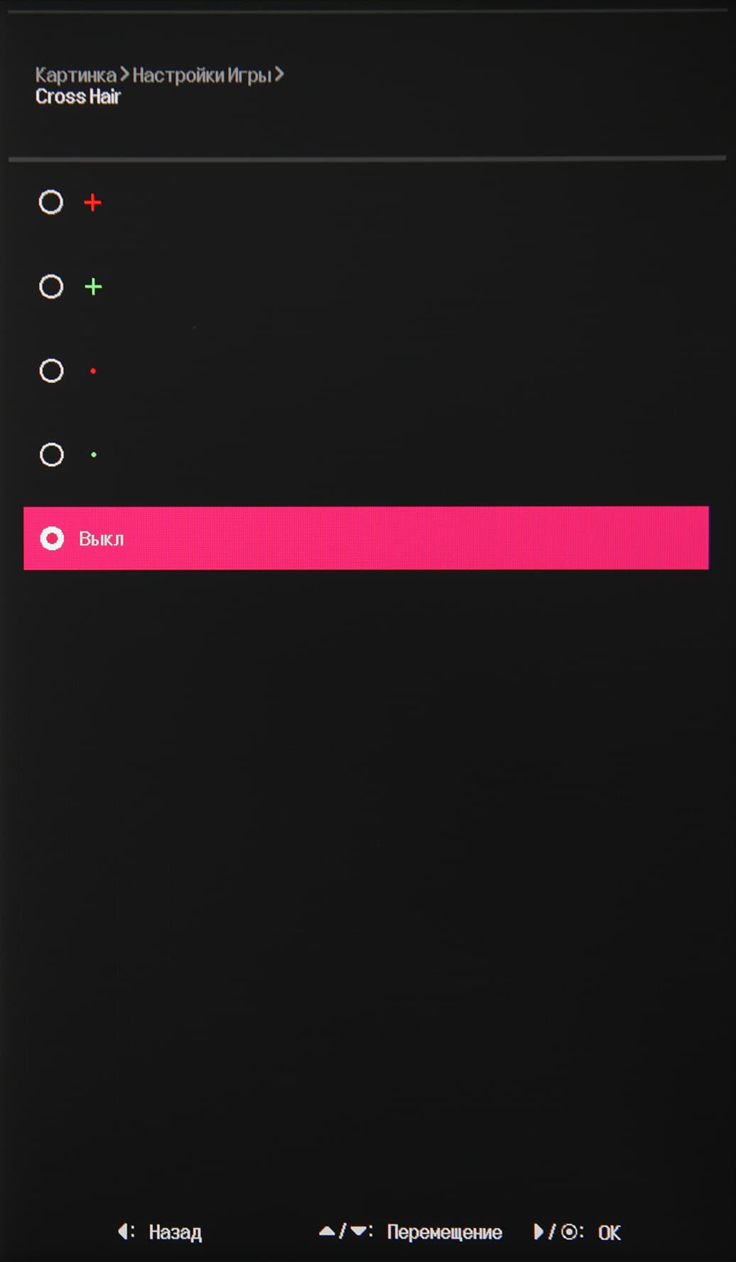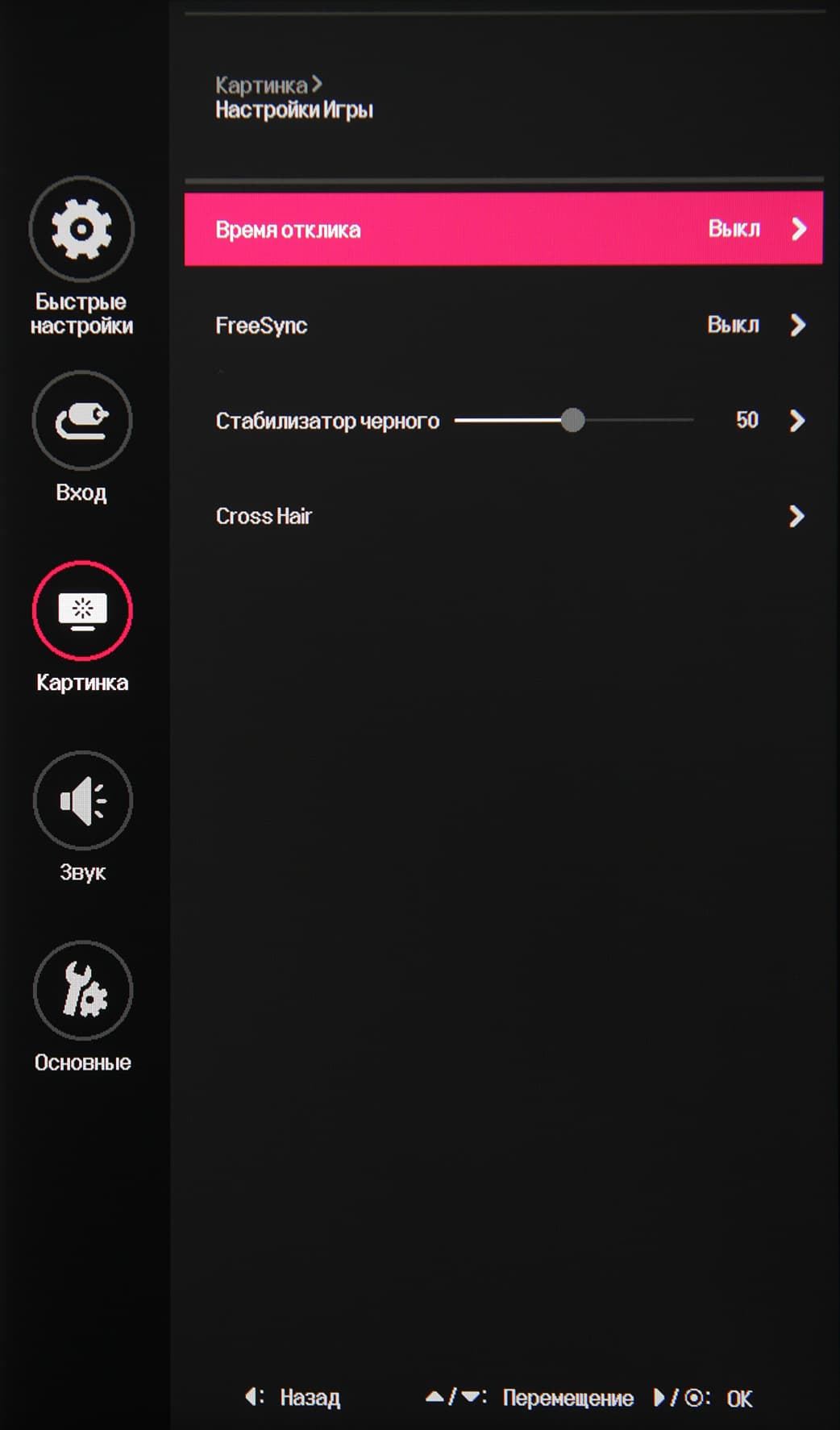 Игровые настройки находятся на отдельной странице — управление разгоном матрицы, включение/выключение AMD FreeSync, регулировка гамма-кривой в темной области и экранный прицел (Cross Hair).