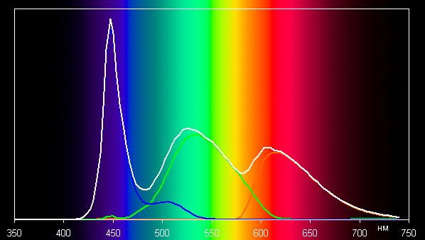 Такой спектр с относительно узким пиком синего и с широкими горбами зеленого и красного цветов характерен для мониторов, в которых используется светодиодная подсветка с синим излучателем и желтым люминофором.