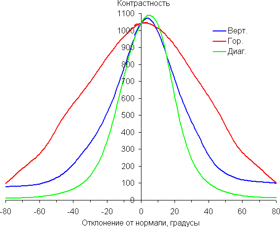 Отметим плавное уменьшение яркости при отклонении от перпендикуляра к экрану в горизонтальном направлении, при этом графики не пересекаются во всем диапазоне измеряемых углов. Чуть быстрее падает яркость при отклонении в вертикальном направлении. При отклонении в диагональном направлении поведение яркости оттенков имеет промежуточный характер между вертикальным и горизонтальным направлениями, за исключением яркости черного поля, которая начинает резко возрастать уже при 20°-30° отклонения от перпендикуляра к экрану. Если сидеть от экрана на расстоянии 50-60 см, то черное поле по углам будет заметно светлее, чем в центре. Контрастность в диапазоне углов ±82° в случае отклонения по диагонали приближается к отметке 10:1, но не опускается ниже.