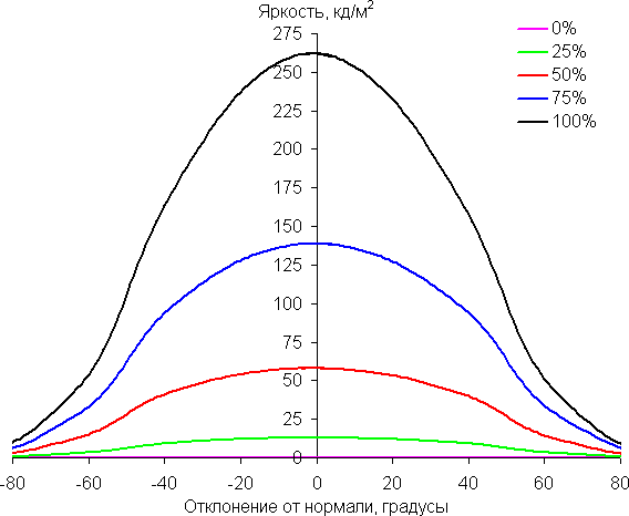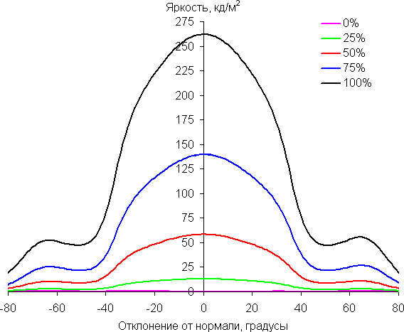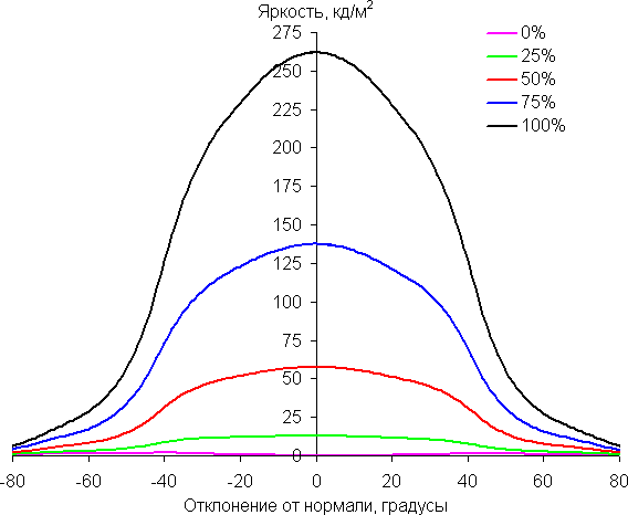 Чтобы выяснить, как меняется яркость экрана при отклонении от перпендикуляра к экрану, мы провели серию измерений яркости черного, белого и оттенков серого в центре экрана в широком диапазоне углов, отклоняя ось датчика в вертикальном, горизонтальном и диагональном (из угла в угол для формата 16:9) направлениях.