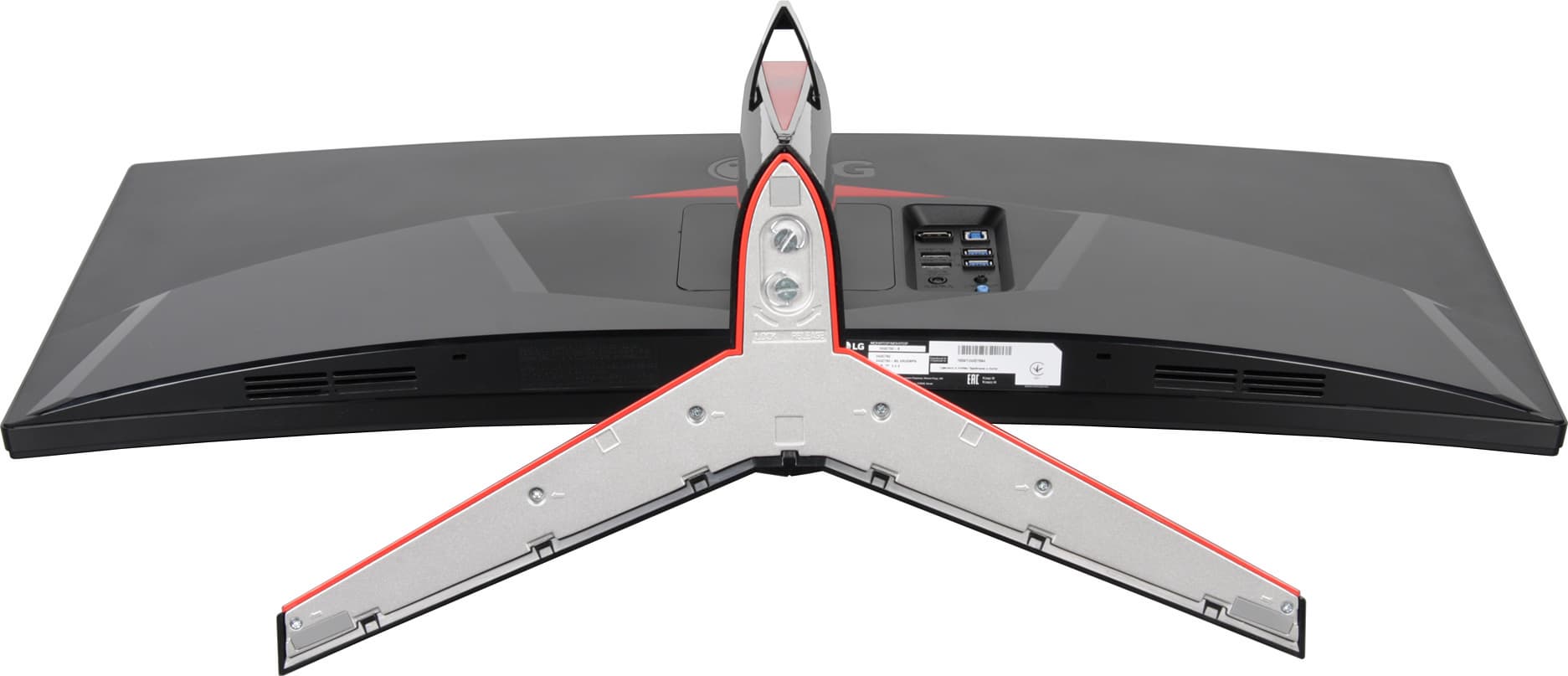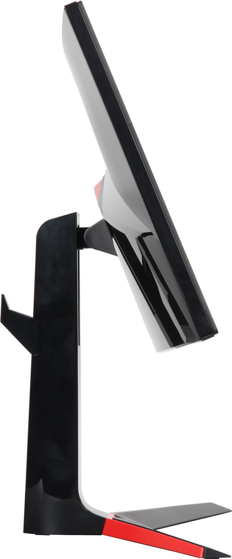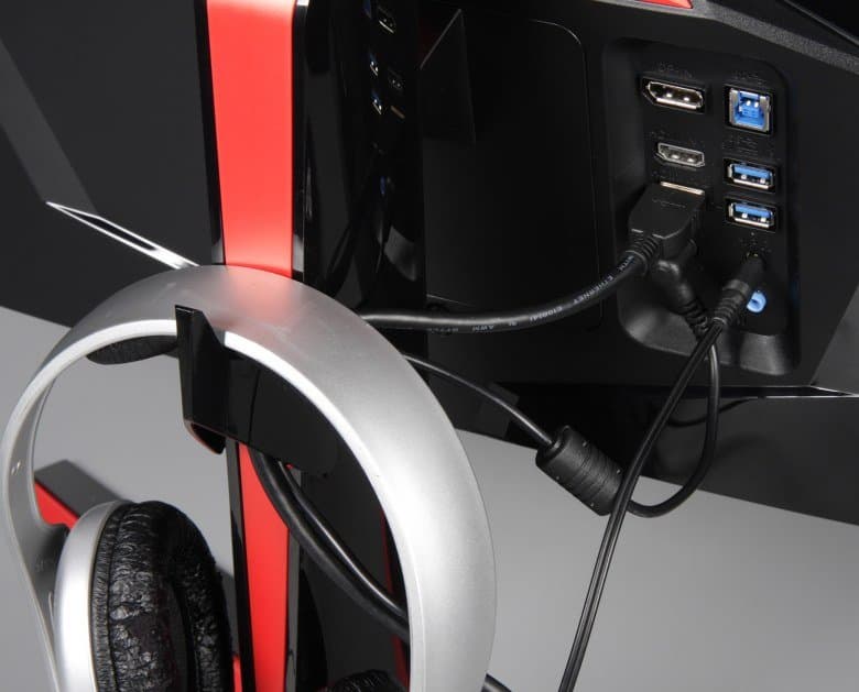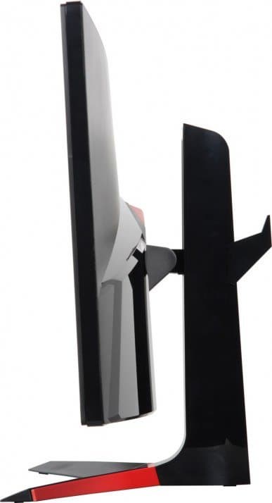 Подставка состоит из двух частей — из основания и стойки. Чтобы выдержать приличный вес монитора, основание и стойка изготовлены из алюминиевого сплава и стальных штампованных элементов, и только сверху прикрыты кожухами из пластика. На основании есть красная декоративная вставка из пластика. Кабели, идущие от разъемов монитора, можно прижать к стойке входящей в комплект поставки скобой из пластика. Также эта скобка может выступать в роли крюка для наушников.