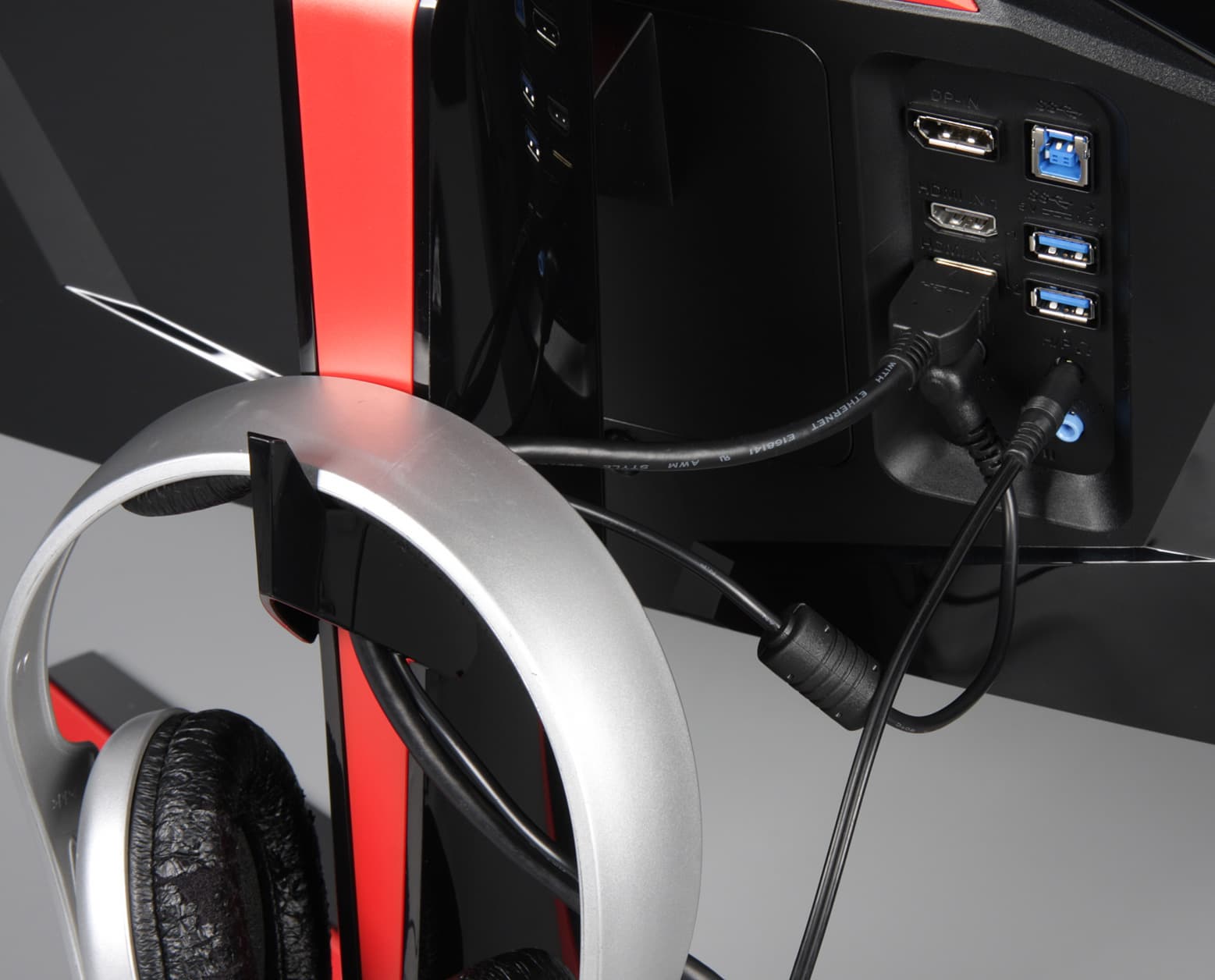 - Удобная регулируемая подставка и скоба-крюк для фиксации кабелей и размещения наушников