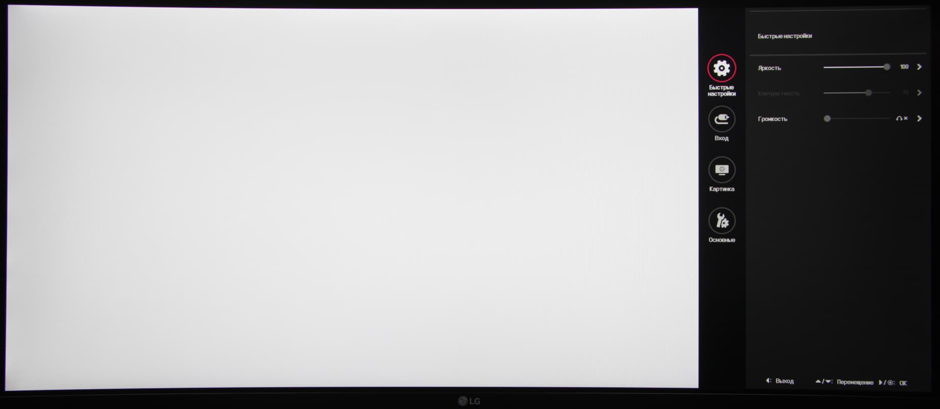 Длительное нажатие всегда выключает включенный монитор. Из стартового меню можно выйти, перейти к выбору входа, к началу основного меню, в игровое меню, или выключить монитор. Далее при навигации по меню в нижней его части выводятся подсказка по текущим функциям джойстика. Меню занимает на экране примерно 1/4 часть площади вертикальной полосой в правой части, что, конечно, мешает оценке вносимых изменений.