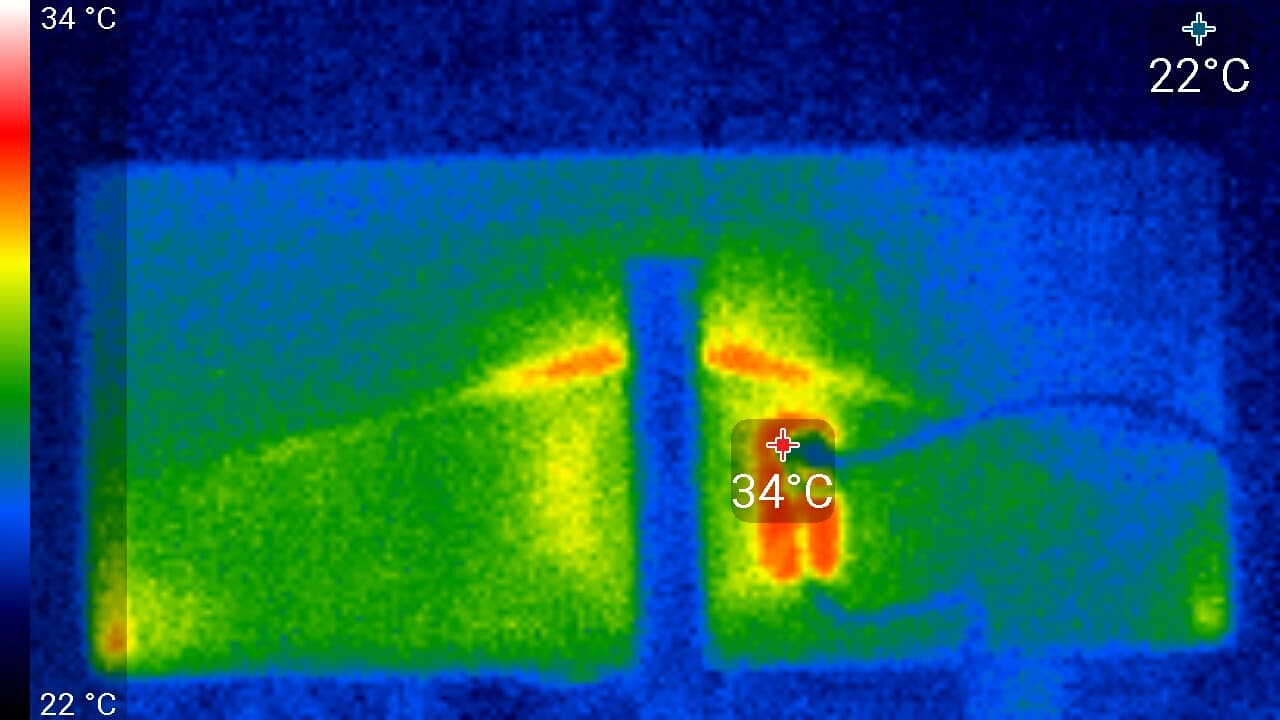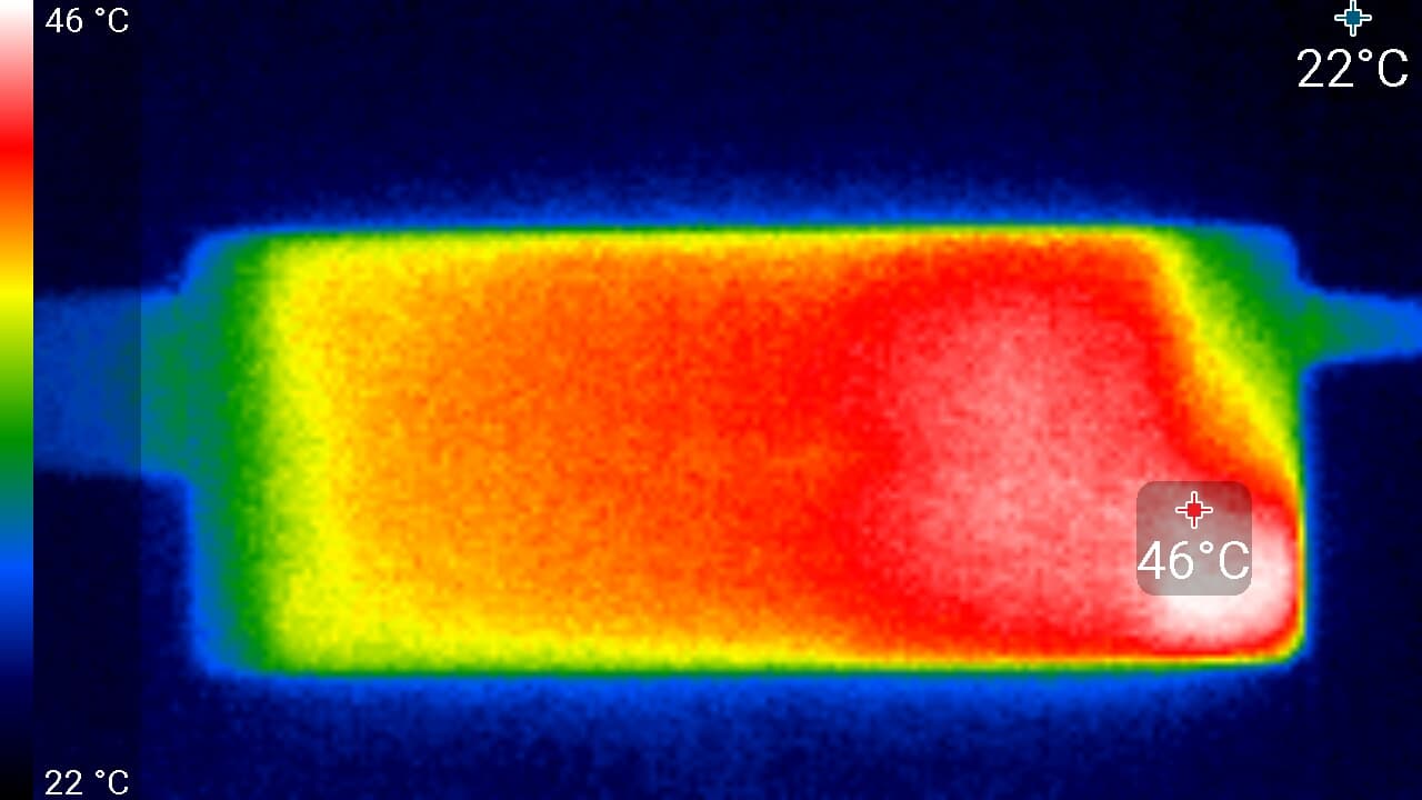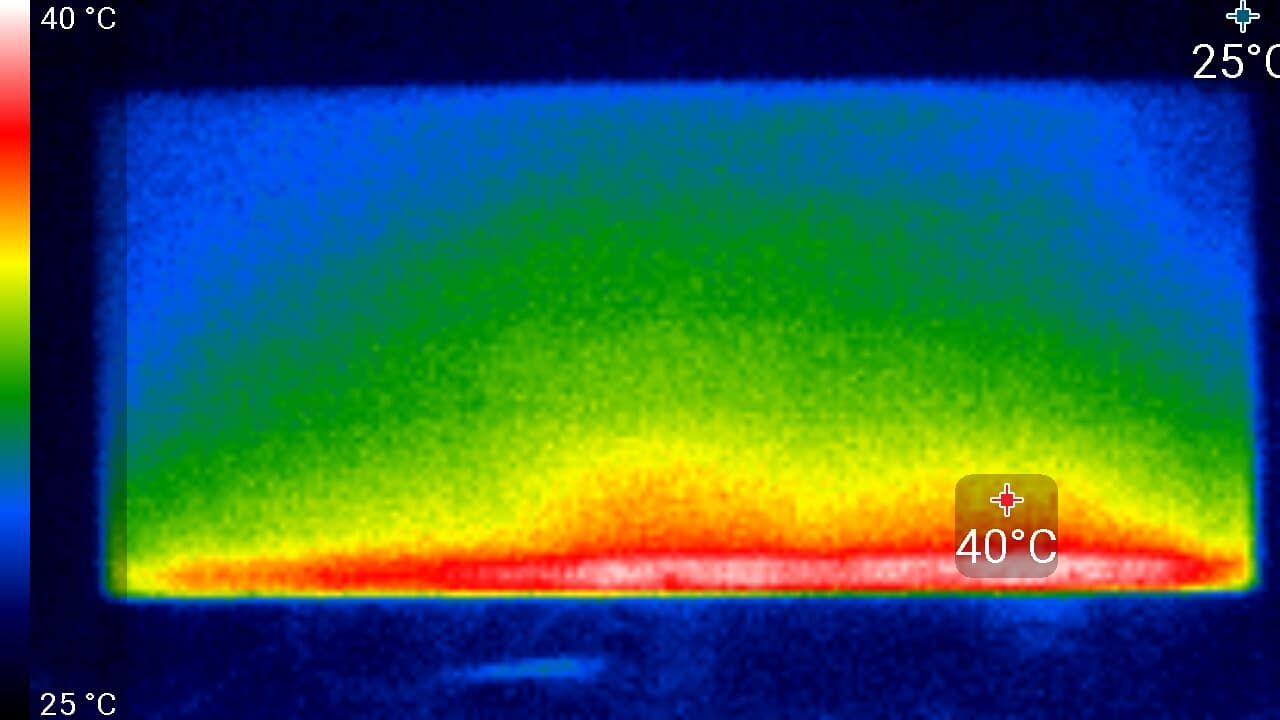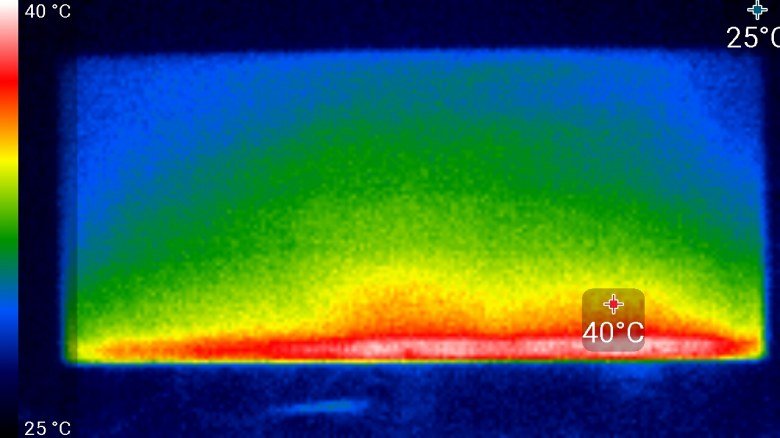 Задняя панель существенно греется только в одной области. Спереди в нижней части экрана была зафиксирована температура в 40 °C — видимо, там находится светодиодная линейка подсветки экрана. Корпус блока питания нагрелся до 46 °C максимум, при этом нагрев хорошо локализован, что свидетельствует о недостаточно хорошем распределении тепла внутри БП: