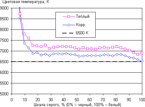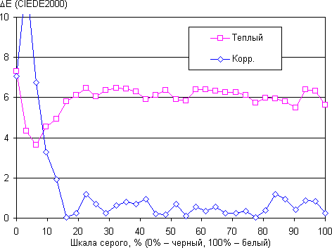 Мы попытались вручную скорректировать цветовой баланс, регулируя усиление трех основных цветов. Графики ниже показывают цветовую температуру на различных участках шкалы серого и отклонение от спектра абсолютно черного тела (параметр ΔE) без вмешательства и после ручной коррекции: