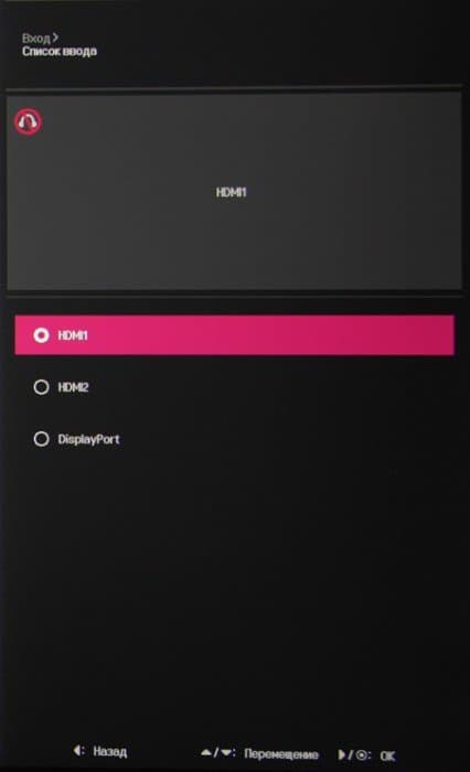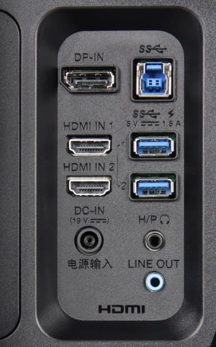 Монитор оснащен тремя цифровыми входами: DisplayPort в полноразмерном варианте и парой HDMI версии 2.0. Есть отключаемая функция автоматического поиска сигнала на входах. Видеовходы способны также принимать цифровые аудиосигналы, которые выводятся после преобразования в аналоговый вид через гнезда миниджек 3,5 мм — линейный выход и выход на наушники. Мощности выхода хватило, чтобы в 32-омных наушниках с чувствительностью 112 дБ был огромный запас по громкости. Качество звука в наушниках хорошее — звук чистый, в паузах шума не слышно, диапазон воспроизводимых частот широкий. В монитор встроен концентратор USB (3.0) с одним входом и двумя выходами. Блок питания внешний. По разъему и вольтажу может подойти и универсальный БП для ноутбука. Для USB-выходов заявлена поддержка быстрой зарядки. Какой поддерживается стандарт — не указано, но так как маркировка портов обещает до до 1,5 А при 5 В, видимо, это Battery Charging v1.2. В меню можно выбрать, включать ли режим быстрой зарядки. Выбор входа осуществляется в основном или коротком меню установок.