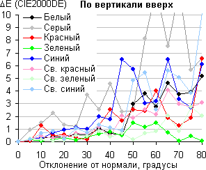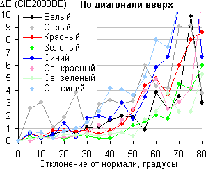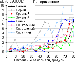 Для количественной характеристики изменения цветопередачи мы провели колориметрические измерения для белого, серого (127, 127, 127), красного, зеленого и синего, а также светло-красного, светло-зеленого и светло-синего полей во весь экран с использованием установки, подобной той, что применялась в предыдущем тесте. Измерения проводились в диапазоне углов от 0° (датчик направлен перпендикулярно к экрану) до 80° с шагом в 5°. Полученные значения интенсивностей были пересчитаны в ΔE относительно замера каждого поля при перпендикулярном положении датчика относительно экрана. Результаты представлены ниже: