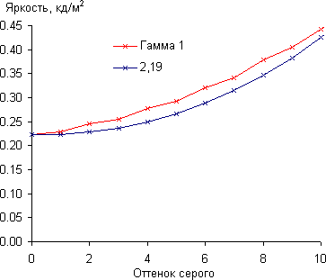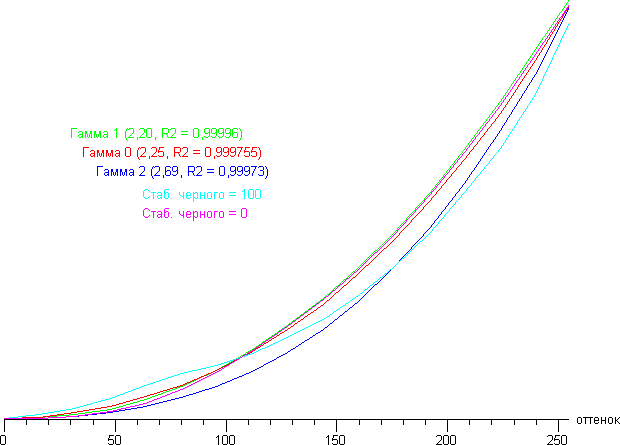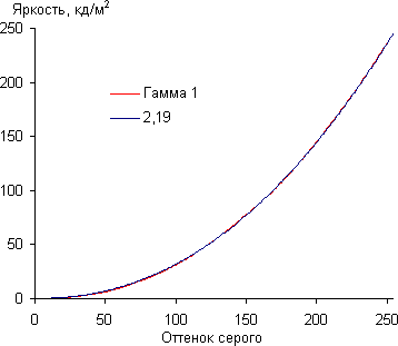Аппроксимация полученной гамма-кривой дала показатель 2,19, что очень близко к стандартному значению 2,2, при этом реальная гамма-кривая почти не отклоняется от аппроксимирующей степенной функции: