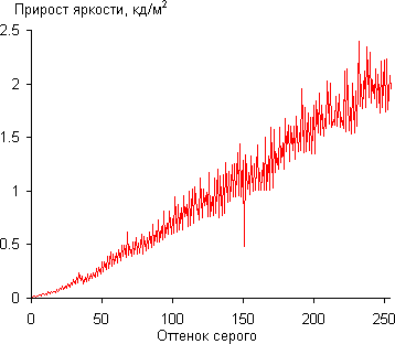 Видно, что с помощью Стабилизатор черного пользователь может слегка увеличить или уменьшить яркость в тенях. Реальная гамма-кривая ближе всего к стандартной при выборе Гамма 1 и Стабилизатор черного = 50, поэтому далее мы измерили яркость 256 оттенков серого (от 0, 0, 0 до 255, 255, 255) при этом значении. График ниже показывает прирост (не абсолютное значение!) яркости между соседними полутонами: