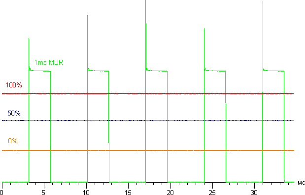 Яркость монитора меняется именно яркостью подсветки, то есть без ущерба для качества изображения (сохраняется контрастность и количество различимых градаций) яркость монитора можно менять в достаточно широких пределах, что позволяет с комфортом работать и смотреть фильмы как в освещенном, так и в темном помещении. На любом уровне яркости значимая модуляция подсветки отсутствует, поэтому нет и никакого мерцания экрана. В доказательство приведем графики зависимости яркости (вертикальная ось) от времени (горизонтальная ось) при различных значениях настройки яркости: