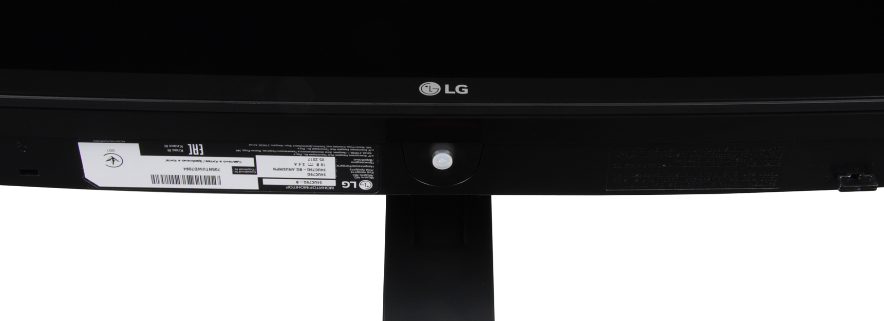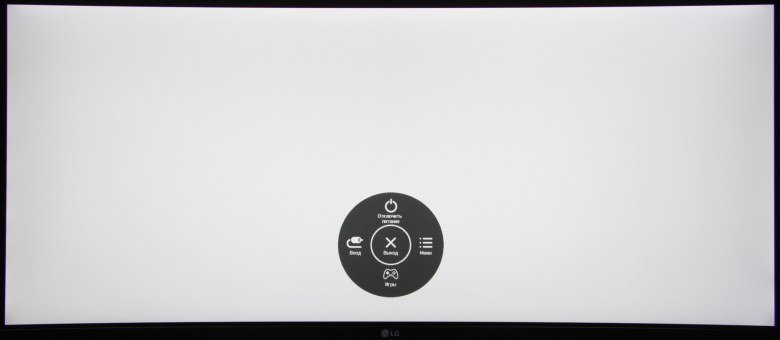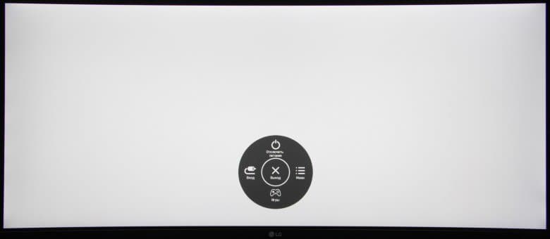 Плоскость экрана слегка изогнута по цилиндру так, что правый и левый край выдвинуты вперед. По отражению в экране видно, что условный радиус изгиба составляет порядка трех метров, но он не очень равномерный, при перемещении в горизонтальном направлении от центра к краям сначала экран почти плоский, затем изогнутый по радиусу, а по бокам в области около 8-10 см экран даже немного выпуклый. Фронтальная поверхность экрана выглядит как монолитная черная полуматовая (зеркальность отчасти присутствует) поверхность, ограниченная снизу относительно узкой стальной рамкой с матовым черным покрытием, а по периметру — узкой окантовкой из черного пластика без покрытия. Выведя изображение на экран, можно увидеть, что на самом деле между окантовкой и собственно областью отображения есть узкие поля. Органом управления и индикации режимов служит небольшой пятипозиционный (отклонение по четырем направлениям и нажатие) джойстик из матового полупрозрачного пластика, расположенный по центру на нижней грани блока монитора.